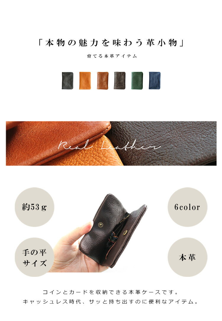 商品詳細商品名 コインケース カードケース 2つ折り 本革 レザー 小銭入れ 小さい財布 カラフルレザービーズ カラー ブラック/ブラウン/ダークブラウン/コーヒーブラウン/グリーン/ブルー サイズ横幅:約7cm高さ:約11cm厚み:約1.5cm重量:約50g開閉 ボタン素材 マットオイルレザー (本革) ポケット ファスナーポケットポケット商品説明 天然革ならではのシボ感が楽しめるマットオイルレザーを使用した2つ折りボタンタイプのミニウォレットです。
