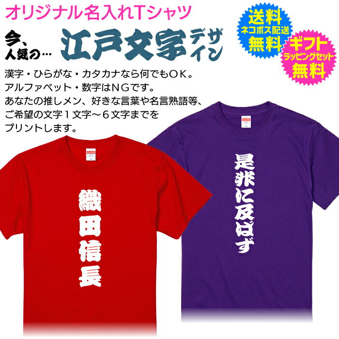 商品情報 Tシャツ/素材 綿100%5.6oz 半袖TシャツTシャツカラーとプリントカラーの組合せ 全18バリエーションTシャツのサイズ 全12サイズプリント/仕様 高品質マットラバーシート熱転写プリント名入れTシャツ 【江戸文字デザインTシャツ】 オリジナル名入れTシャツ 送料無料/ネコポス配送 勘亭流 寄席文字 籠文字 ギフトセット無料 半袖 Tシャツ 自分で着てもヨシ!ギフトで送って喜ばれるもヨシ! [TS-131] 江戸文字デザイン ご希望の文字でオリジナル名入れTシャツ作ります 送料無料 ギフトセット無料 嵐 ARASHI ももいろクローバーZ ももクロ 【送料無料/ネコポス配送】☆